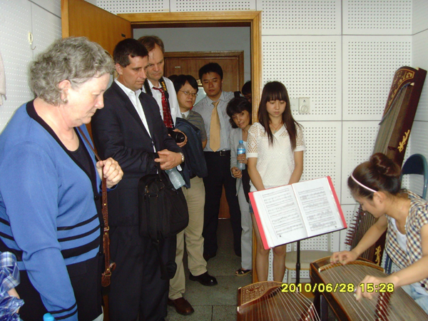 在古天乐太阳集团城经理、黄梅剧艺术公司经理荀安华、副经理刘蕊的引导下,客人一行还参观了艺术楼教室、琴房,饶有兴趣地观摩了马强伟老师的竹笛教学公开课,参观了数码钢琴教室,欣赏了员工的古筝表演,灵活多样的课堂教学形式,员工富有激情的弹奏表演,给美国客人留下了深刻的印象。