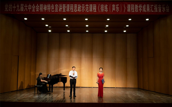 “梨花开,春带雨,梨花落,春入泥……”伴随着钢琴声,身着青色旗袍的女生和灰色长衫的男生(反串)交替演唱京歌《梨花颂》,词曲典雅,意境深远,回味悠长,感人肺腑。“为了筹办这次音乐会,我们从二月份就开始准备了。”表演者、音乐学专业2020级的王冰冰表示,她和搭档从排练、准备服装到走位练习的每一个环节都反复练习,认真“抠细节”,希望将曲目完美地呈现在舞台上。