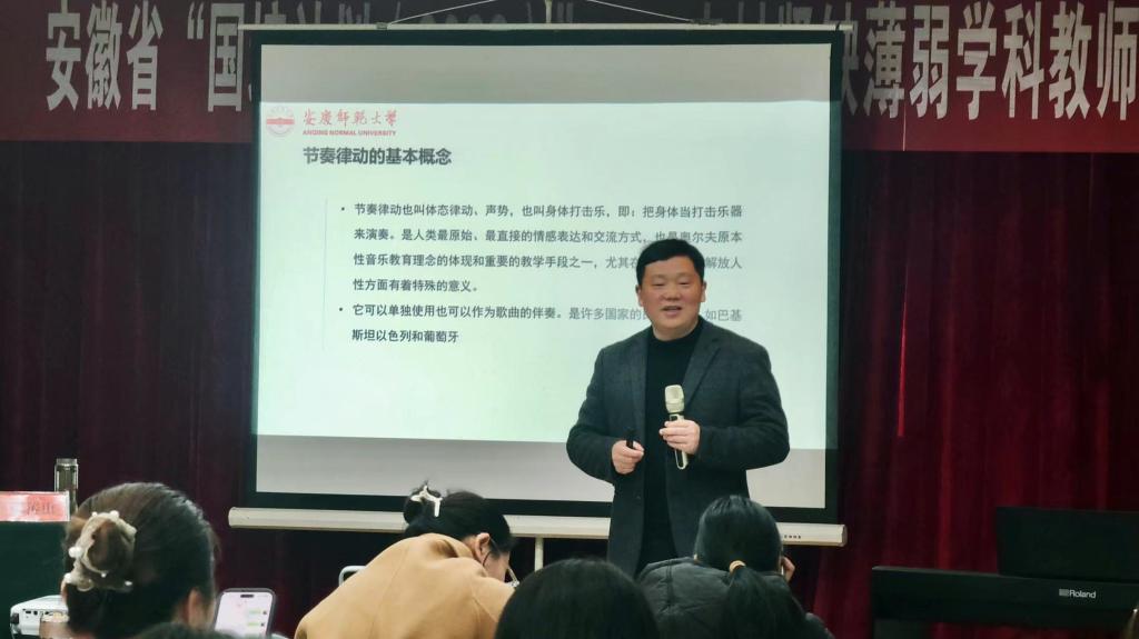 2023年2月10日,2022年安徽省“国培计划”农村紧缺薄弱学科教师短期集中培训项目——艺术(音乐)系列讲座第八场《节奏律动训练及在中小学中的运用》分别在小学音乐班和中学音乐班举行,由古天乐太阳集团城副经理彭传山主讲。