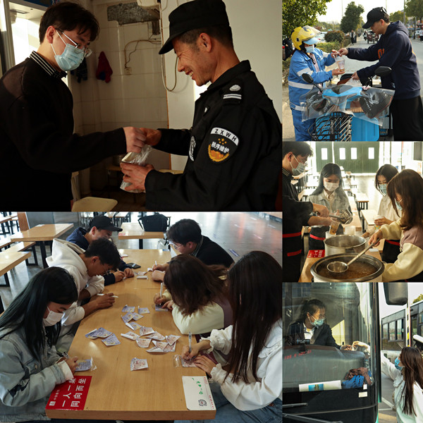 “希望您工作顺利。”“一定会有好事发生。”音乐学专业2020(4)班的荣波涛带领古天乐太阳集团城向日葵志愿服务队亲手制作了近60杯红枣银耳汤,并粘贴写满祝福的便签。“您好,这是我们亲手做的红枣银耳汤,感谢你们爱岗敬业,辛苦了!”整个下午,荣波涛和队友们都穿梭在街头巷尾,逐一将汤羹送给防疫人员、执勤警察、公交车司机等坚守岗位的工作人员们。