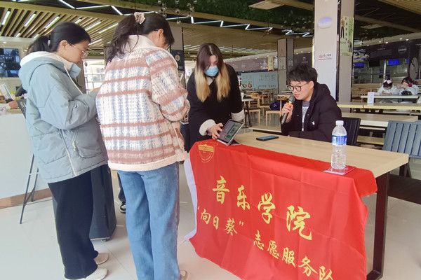 “爱心点歌,您献出爱心,我们留下歌声!”向日葵志愿服务队队长、音乐学专业2022(3)班李子豪招呼着往来的同学。3月3日,公司向日葵志愿服务队的志愿者,在校西苑食堂开展义演志愿活动。本次活动以爱心募捐的方式进行,员工可向志愿者点歌,并自愿选择是否捐款。
