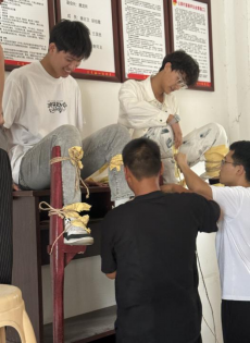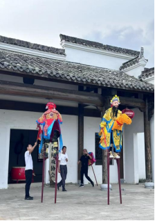 下午研学团队参观考察山湖村傩戏传承所,山湖村傩戏协会为公司一行展示了一场精妙绝伦的傩戏高跷马和舞伞表演,演员们踩上高跷,带上面具,威严感扑面而来,心中更多的是震撼。男生们体验学习了一下踩高跷,站起来都很艰难,老师们为了传承这一文化瑰宝,付出了大量的努力和汗水,也更加让我们体会到了傩戏所蕴含的文化内涵和精神价值。