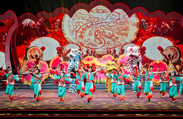 长扇花状翻转轻盈飘逸,伴随着大鼓的一声声响亮锤击,东北秧歌的讨喜亲切带动全场,身着彩衣的舞者携着舞狮翩然而出,狮头摇摆,狮尾翻腾。紧接着,舞小龙的彩绸队伍踏着悠扬旋律,翻腾跳跃……开场曲《春开幸福门》“热”了起来,让整场晚会浸郁在浓厚的节日氛围。